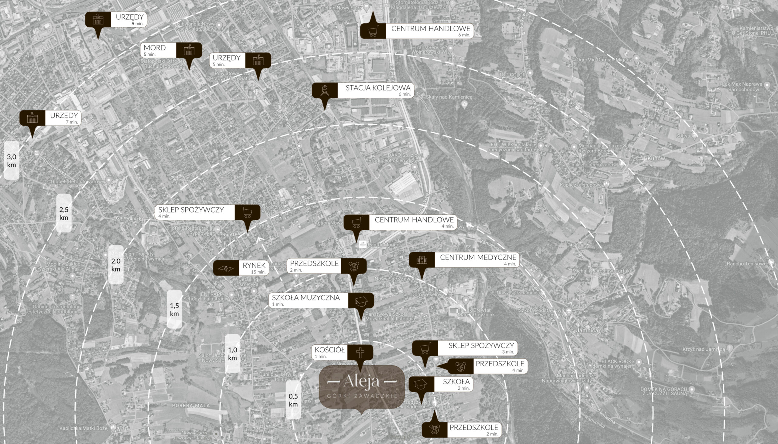 Osiedle znajduje się w bardzo dobrej lokalizacji, otoczonej przez liczne udogodnienia. W odległości ok. 1 km od osiedla znajdują się przedszkole, szkoła podstawowa, szkoła muzyczna oraz kościół, co sprawia, że jest to idealne miejsce dla rodzin z dziećmi. Dodatkowo, w najbliższej okolicy znajdują się sklepy oraz centra handlowe, co ułatwia codzienne zakupy i zapewnia dostęp do usług.